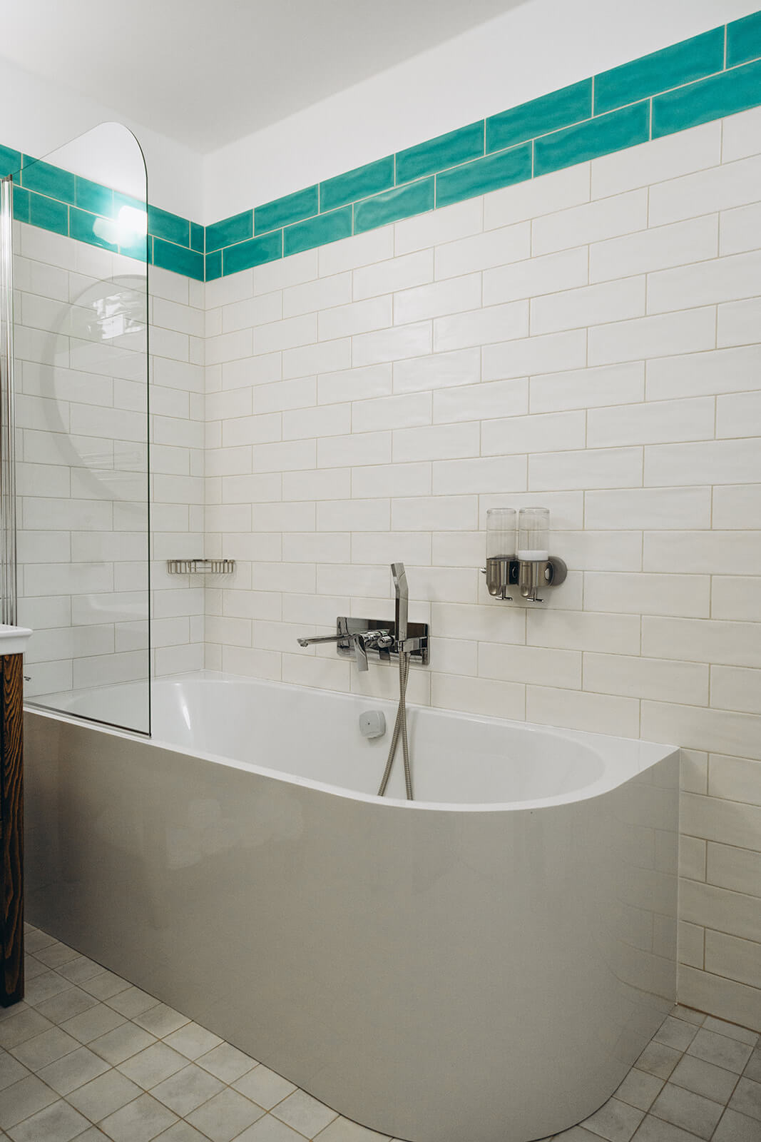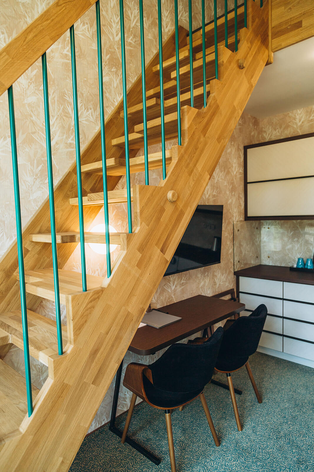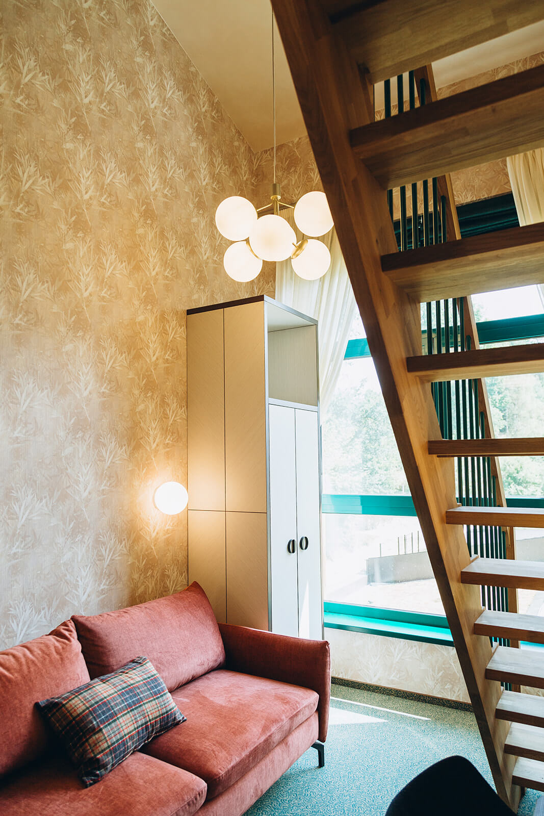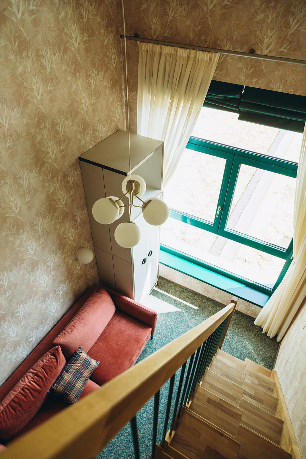The walls of the apartment are wallpapered with a décor of marsh grasses and plants. The velvet three-seater has a salmon pink hue like a beautifully coloured koi carp. Dominating the chandeliers are clusters of glass light bubbles that cast reflections on the pearl-painted ceilings. Everything is connected by the opal green on the frames and clothing of the windows, on the carpets in tiny frog leaves and on the railing of the staircase to the first floor.