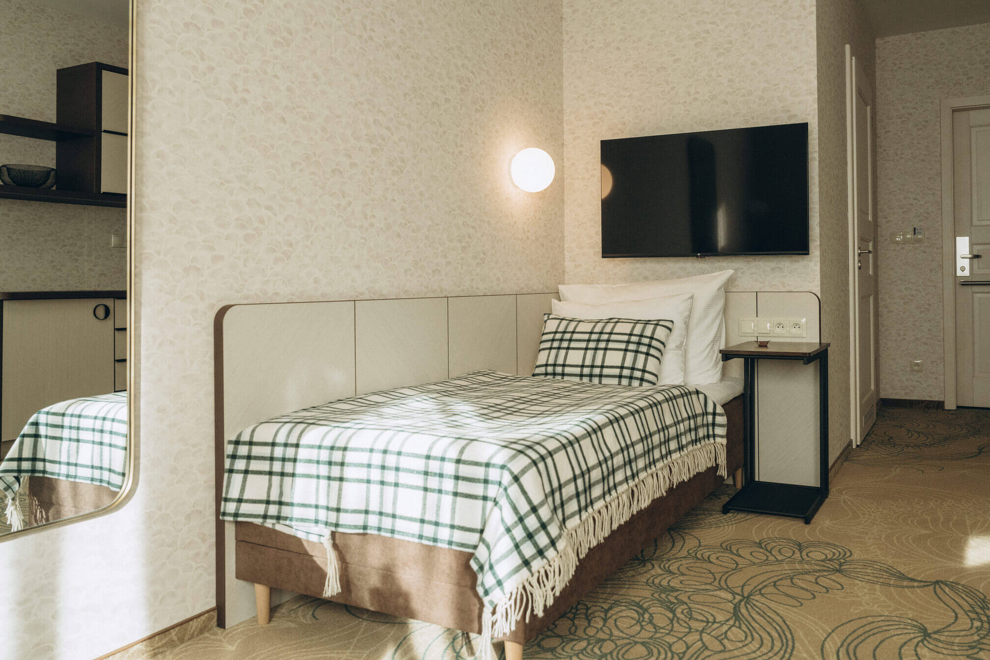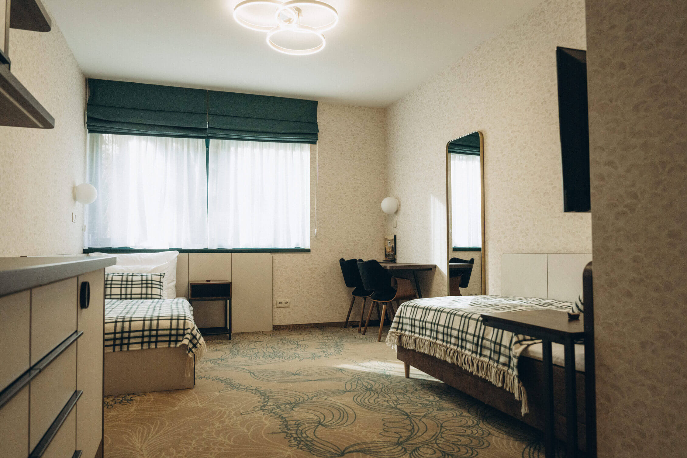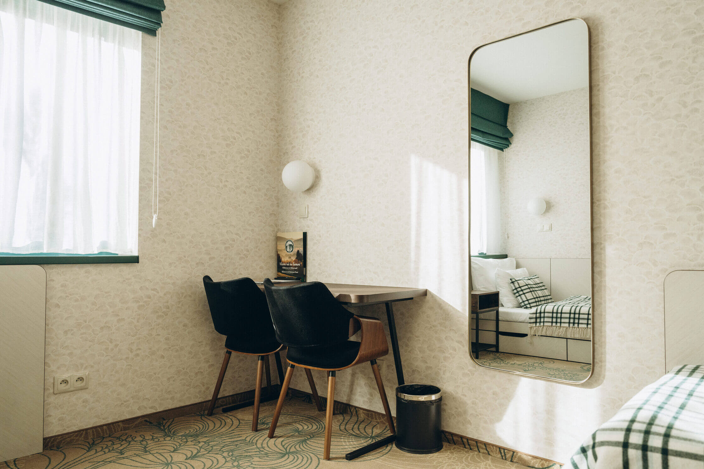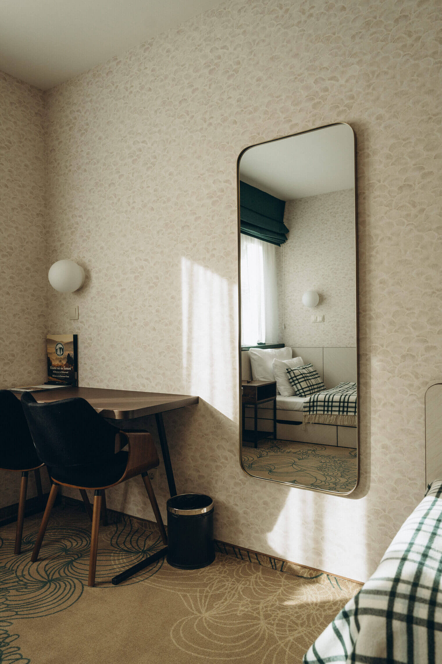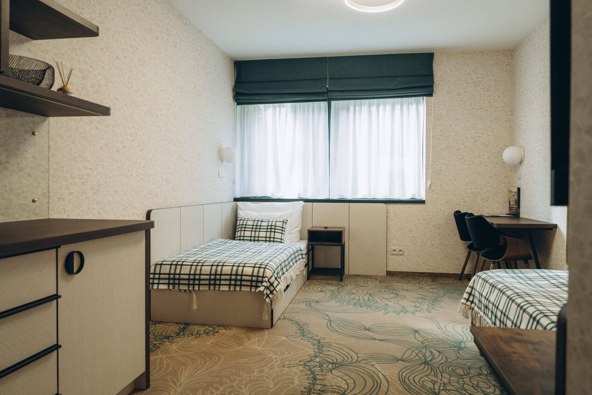 This ground-floor room is distinguished by a designer carpet meant to resemble tangled fishing nets. Caught in this net is also an exotic species of beautifully colored goldfish, represented by a striking golden-rust sofa. The wallpaper features a pattern of beige scales reminiscent of the common bleak.