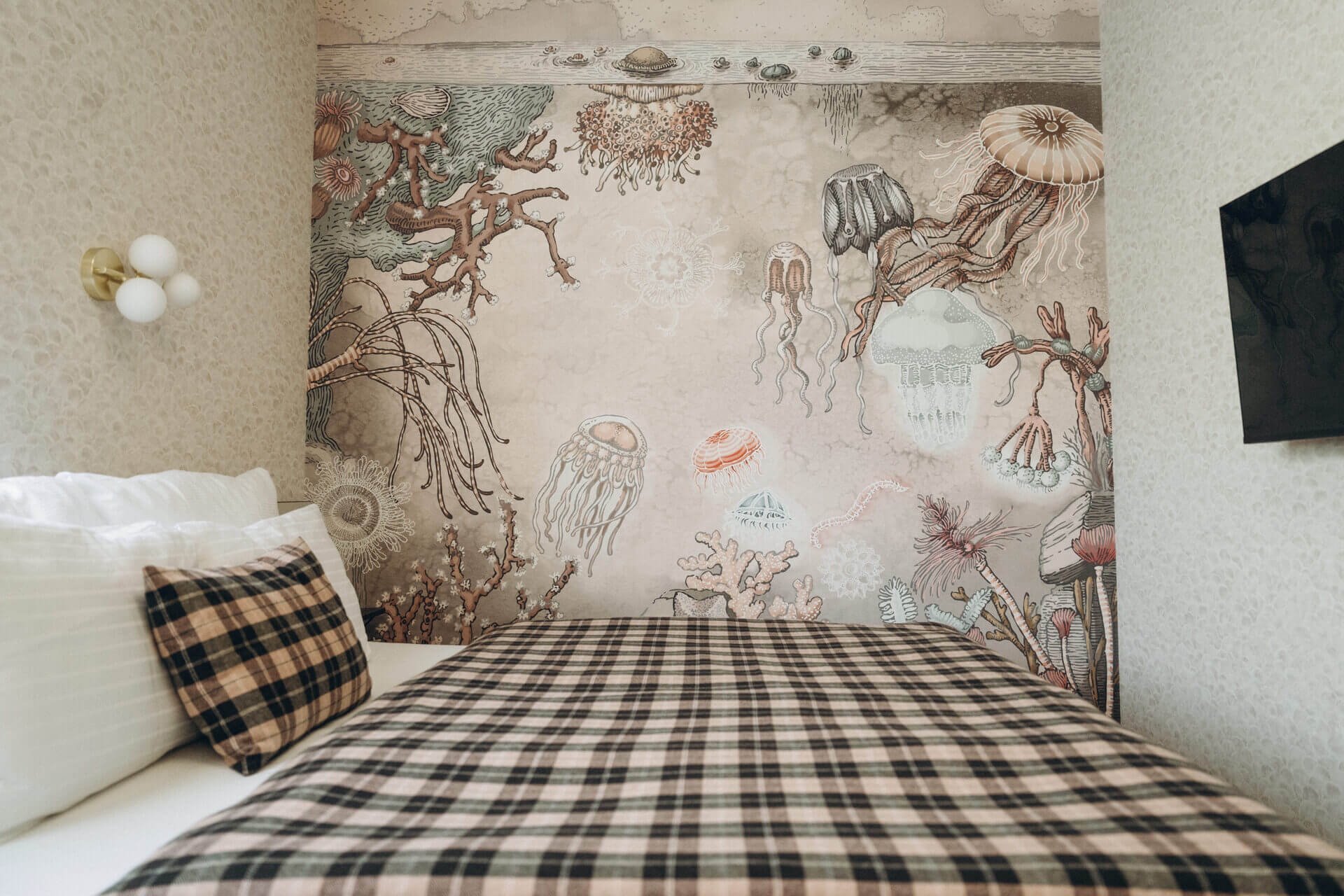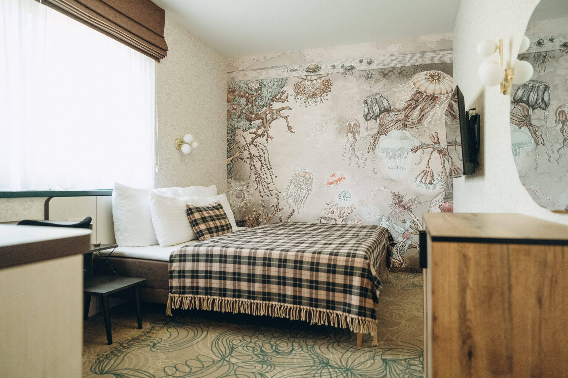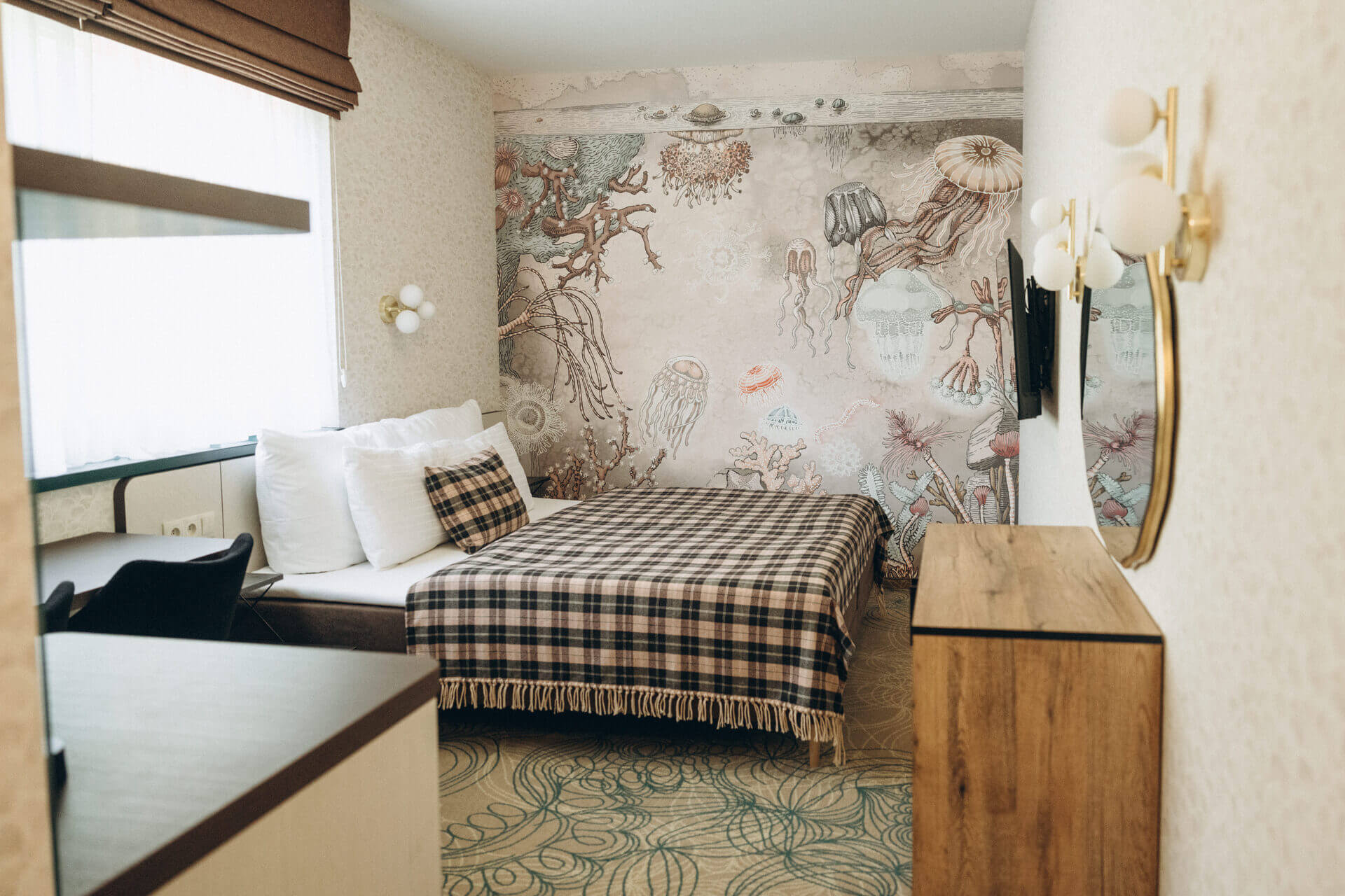 The northernmost room by the access road is a beautiful sea cabin. The wall mural of a fairytale underwater world delights visitors from the moment they enter. It is positioned so that you can enjoy it even more while relaxing. The mural is full of lovely illustrative details and pleasant pastel colors that you won’t grow tired of, and you and your partner will surely enjoy returning to this room again and again.