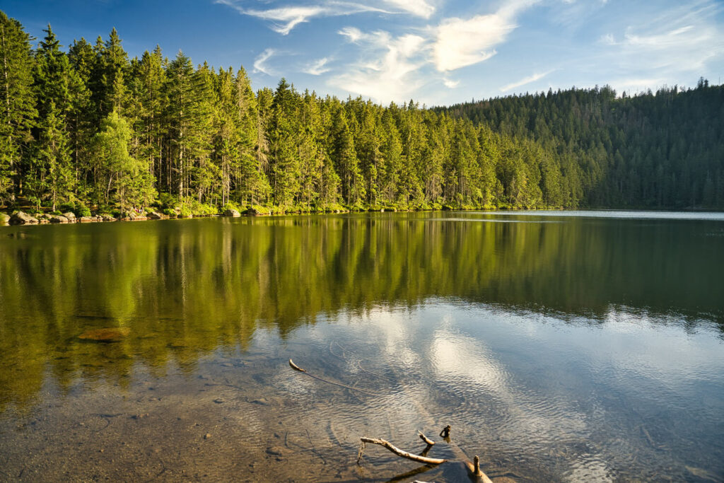 The only lake in Šumava belongs to the Danube basin The lake is part of the National Nature Reserve Černé a Čertovo jezero. The valley in which the Devil’s Lake is located was carved by the devil, according to legend, because a girl he wanted to take to hell tied a large stone to his tail. To this day, goblins and strange figures are said to emerge from the lake. The lake is located at an altitude of 1030 m, its area is 9.7 ha and the lake is 36 m deep in places. The lake has two smaller tributaries and is drained by the Jezerní Brook into the Železný Brook, which is a tributary of the River Regen and then the Danube. The main European watershed runs along the ridge between Jezerní hora and Špičák between the Devil’s Lake and the Black Lake. The water from Lake Čertov therefore drains into the Black Sea, while the nearby Black Lake is drained into the North Sea. It is also interesting to note that the lake walls of both Lake Čertova and Lake Černý jezero are the only places in Šumava where avalanches occur.